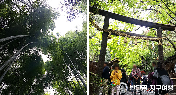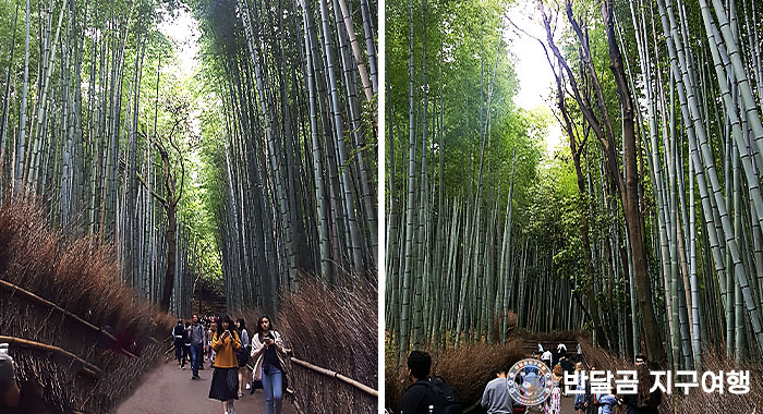 울창한 대나무 숲을 만나고, 많은 관광객들을 따라 대나무 숲들을 따라 이동합니다.
