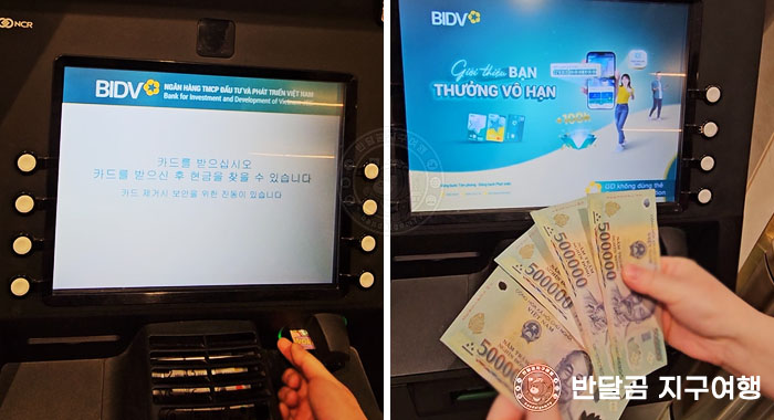 반달곰 지구여행은 5월에도, 9월에도 파나마 나트랑 호텔에서 지냈기 때문에 현금이 필요할 때는 트래블로그 유니온페이 카드를 이용해서 파나마 나트랑 호텔에서 가장 가까운 BIDV ATM 출금기에서 현금을 주로 인출해서 사용했답니다. 호텔 가까운 곳에 ATM기가 있으니 정말 너무 편했어요. 출금 시 수수료가 없기 때문에 현금이 필요할 때마다 출금을 해서 사용했어요. 여행을 다닐 때는 너무 많은 현금을 들고 다니는 것도 부담스럽기 때문에 최소한의 현금 비상금 정도만 출금해서 다녔어요.
