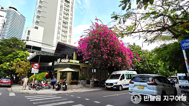 항상 손에는 생수 or 음료수 그리고 손풍기가 꼭 필요해요. 나트랑 시내를 걷다 보면 예쁜 꽃나무들이 많고, 하늘이 보이지 않을 정도로 큰 나뭇잎들이 거리를 꽉 채우고 있답니다.