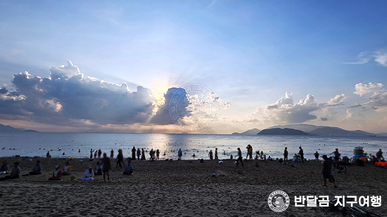 나트랑 일출을 보고 사람들은 각자의 생활로 돌아가고, 반달곰 지구여행은 아름다운 해안선을 따라 잠시 산책의 시간을 가져봅니다. 많은 사람들이 귀여운 강아지와 산책을 나오기도 하고, 해변에 있는 수돗가에서 모래를 씻어내기 위해서 줄을 서는 사람들, 모래사장 한가운데서 요가를 하는 사람들, 해변공원에서 3355 모여 아침체조를 하는 사람들, 모자를 쓰고 이어폰을 꼽고 열심히 조깅하는 사람들, 맨발로 여유롭게 흰모래사장을 걷는 사람들, 각자만의 방식으로 나트랑의 행복한 아침을 만들어 가고 있는 것 같아요.