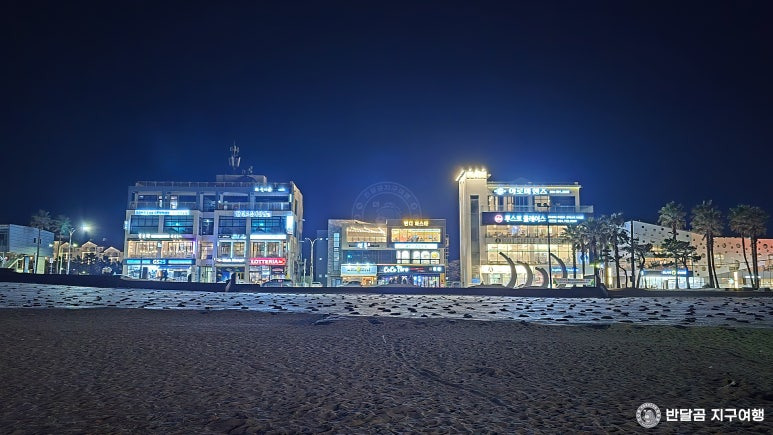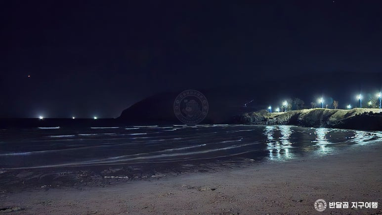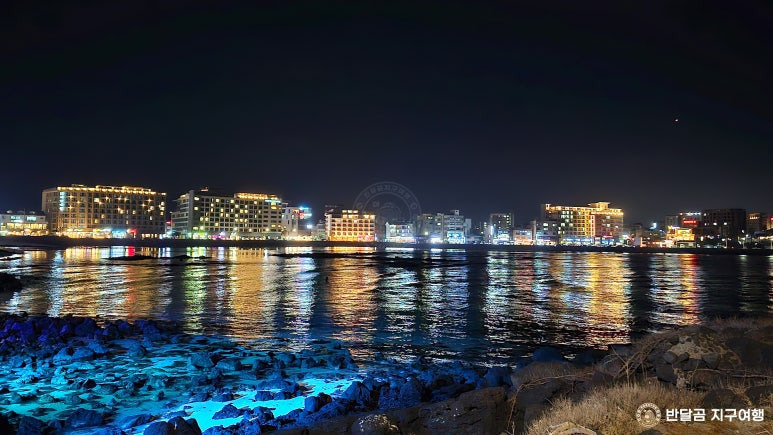 맑은 바다에 파란색 물빛 조명이 비친 제주 밤바다가 더욱 아름답게 느껴집니다.