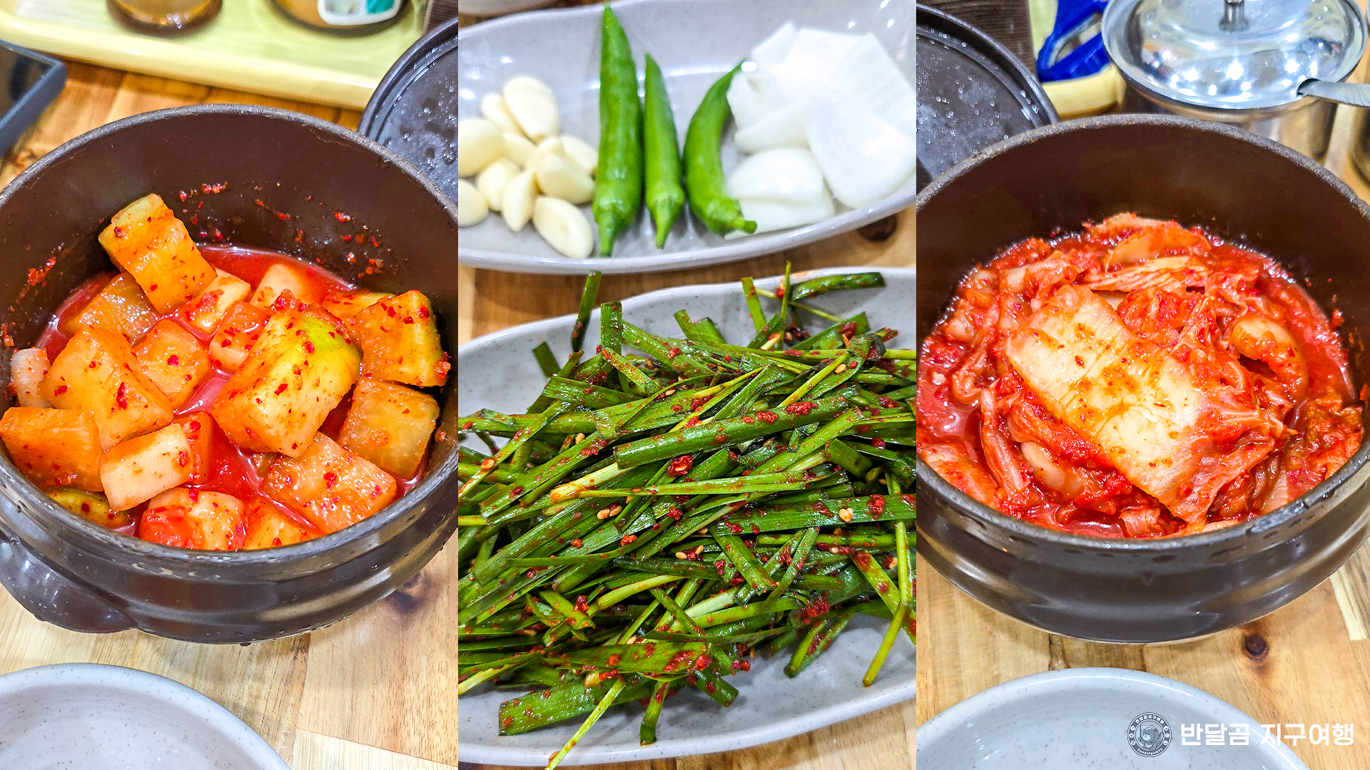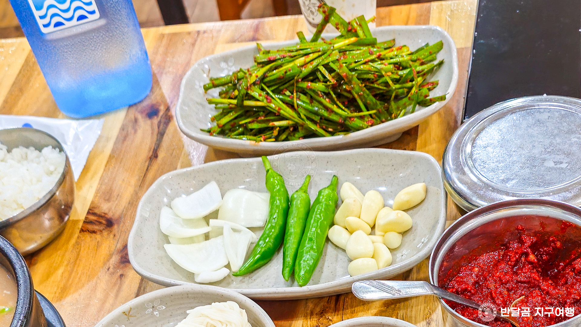 부추무침, 마늘, 청양고추, 양파, 소면, 쌈장, 깍두기, 생김치까지!